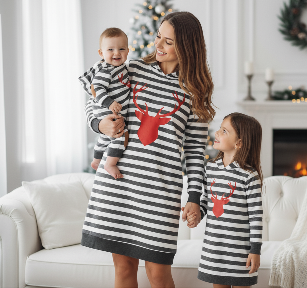 Vestido con capucha a rayas color gris con dibujo de reno color rojo.